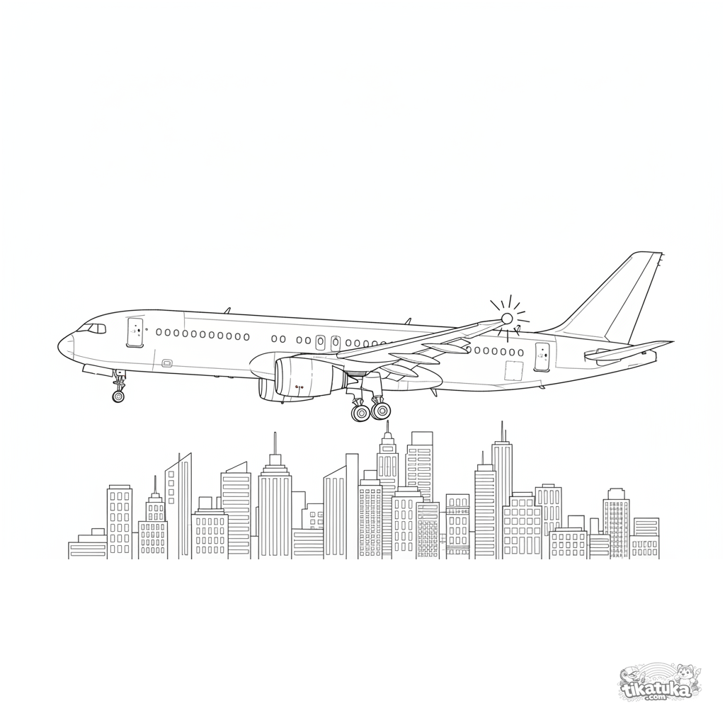 Página para colorear para niños mayores 10-12: un avión comercial en aproximación de aterrizaje sobre una ciudad nocturna. Líneas detalladas, elementos técnicos.