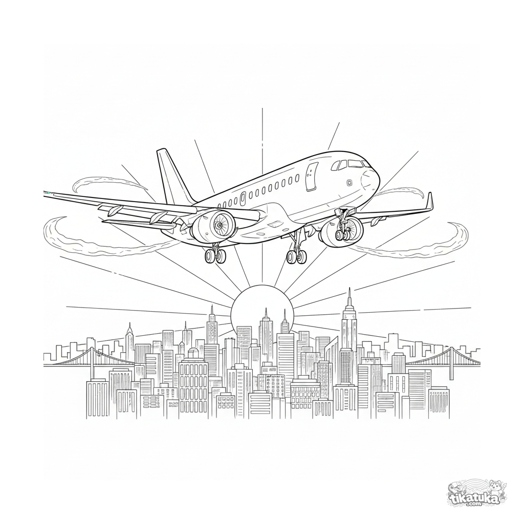Página para colorear detallada de un avión de línea moderno en aproximación de aterrizaje sobre una ciudad al atardecer. Para niños mayores de 10-12 años.
