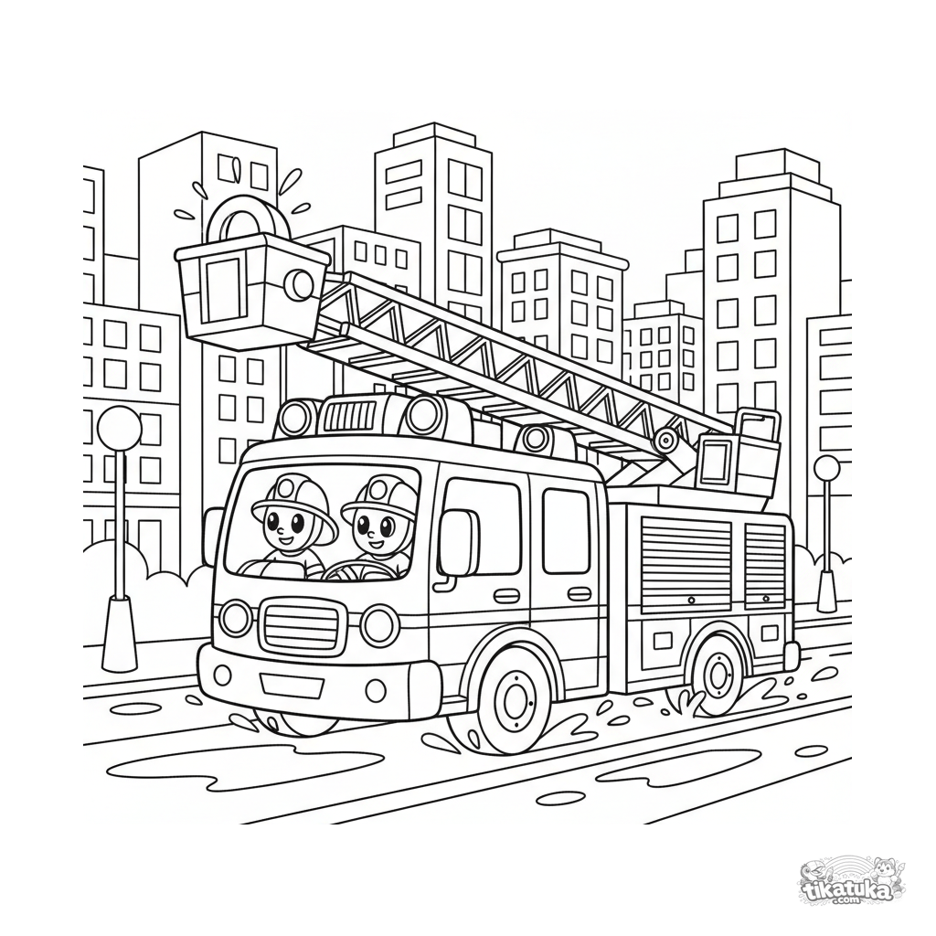 Página para colorear para niños: un camión de bomberos moderno con luces y sirena corre por una calle mojada. Se ven bomberos en la cabina.