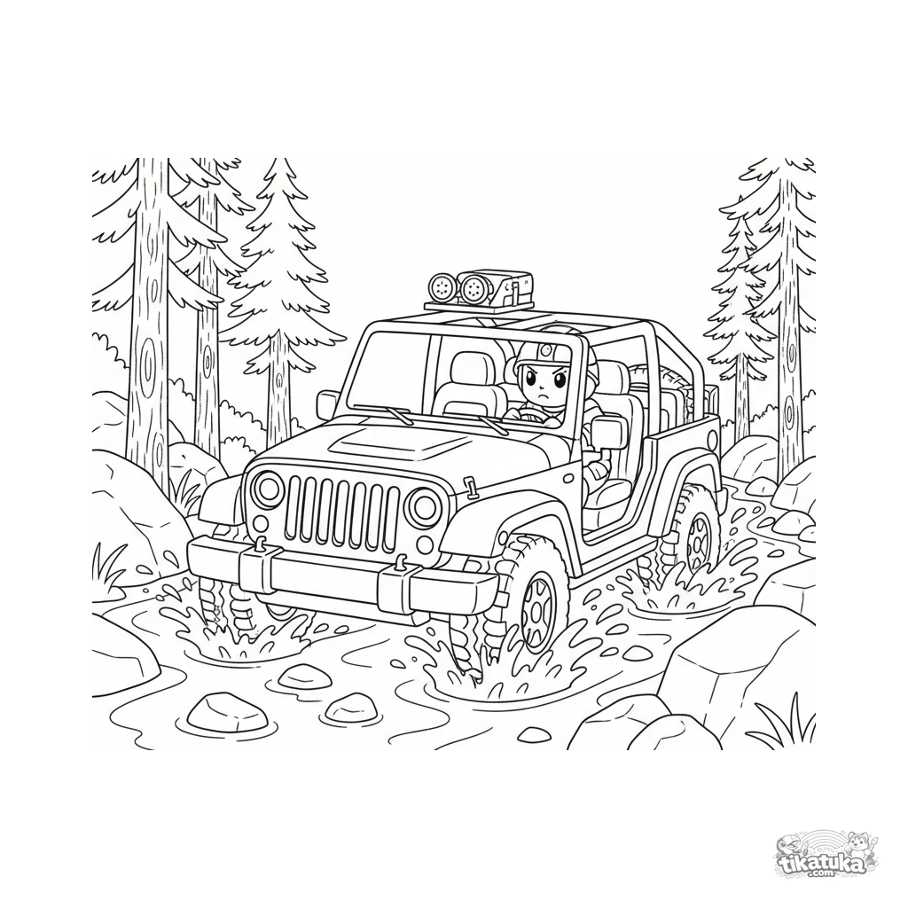 Página para colorear de un jeep militar moderno cruzando un arroyo del bosque. Para niños de 7 a 12 años. Escena detallada con salpicaduras.