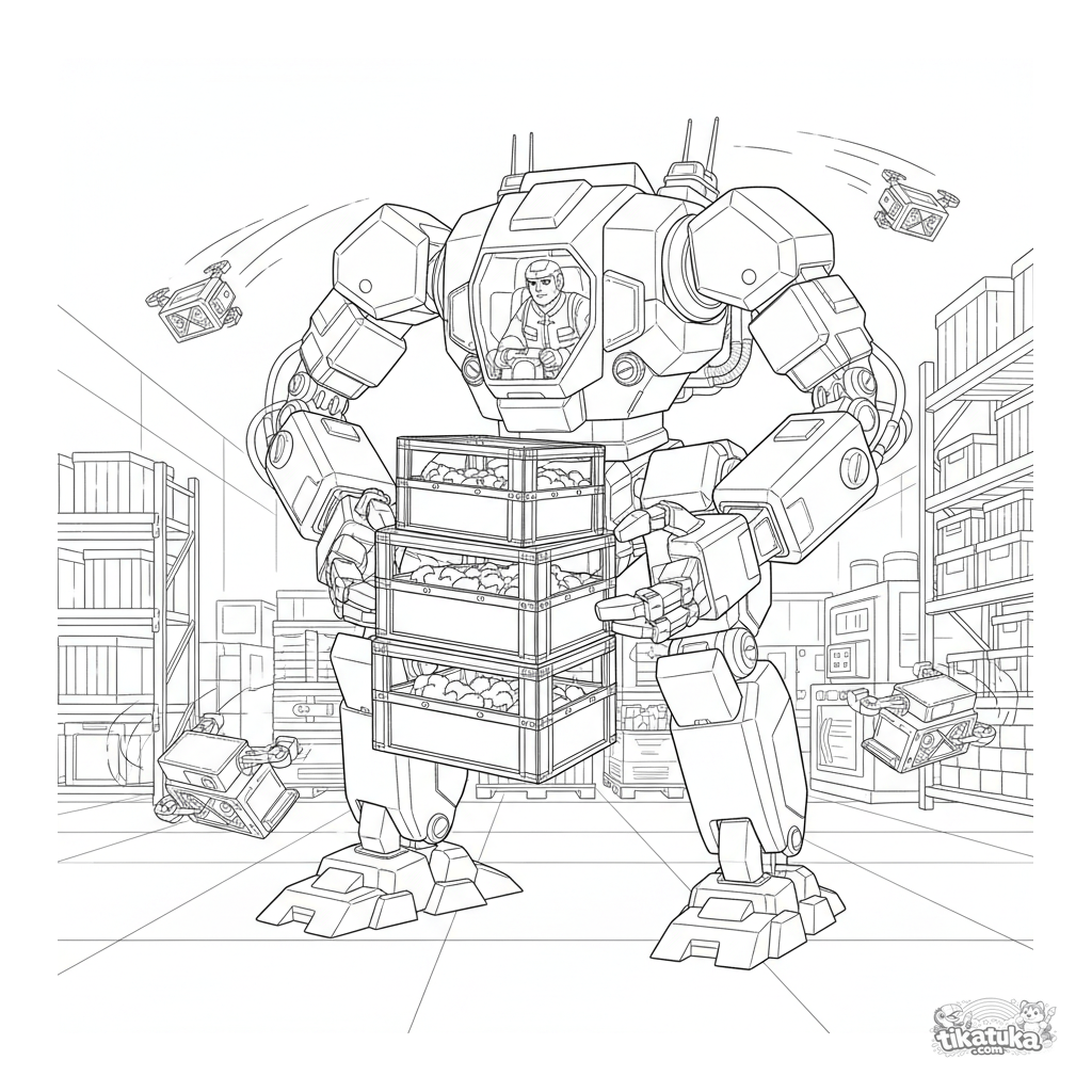 Página para colorear detallada para 10-12 años: un intrincado meca de carga modular con brazos hidráulicos levanta cajas en un almacén. Estilo plano técnico.