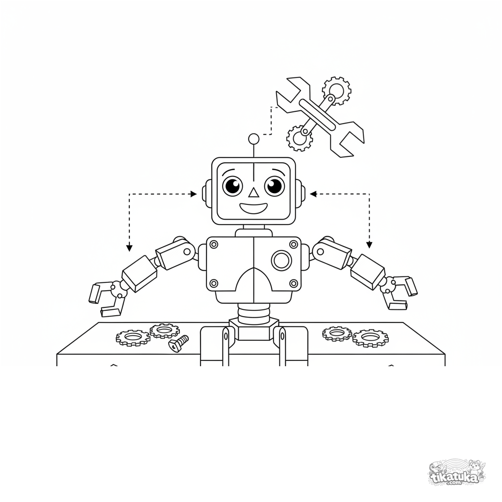 Página para colorear difícil para niños mayores: un robot modular ensamblándose a sí mismo con engranajes y piezas. Alto detalle, imagen realista de maquinaria.