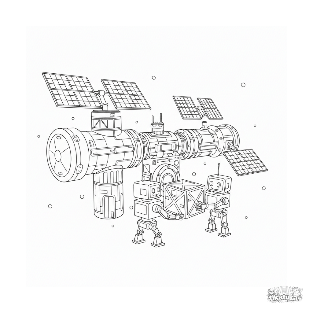 Página para colorear para 10-12 años: una estación espacial modular detallada en el espacio exterior, con robots realizando operaciones de acoplamiento. Estilo de plano técnico.
