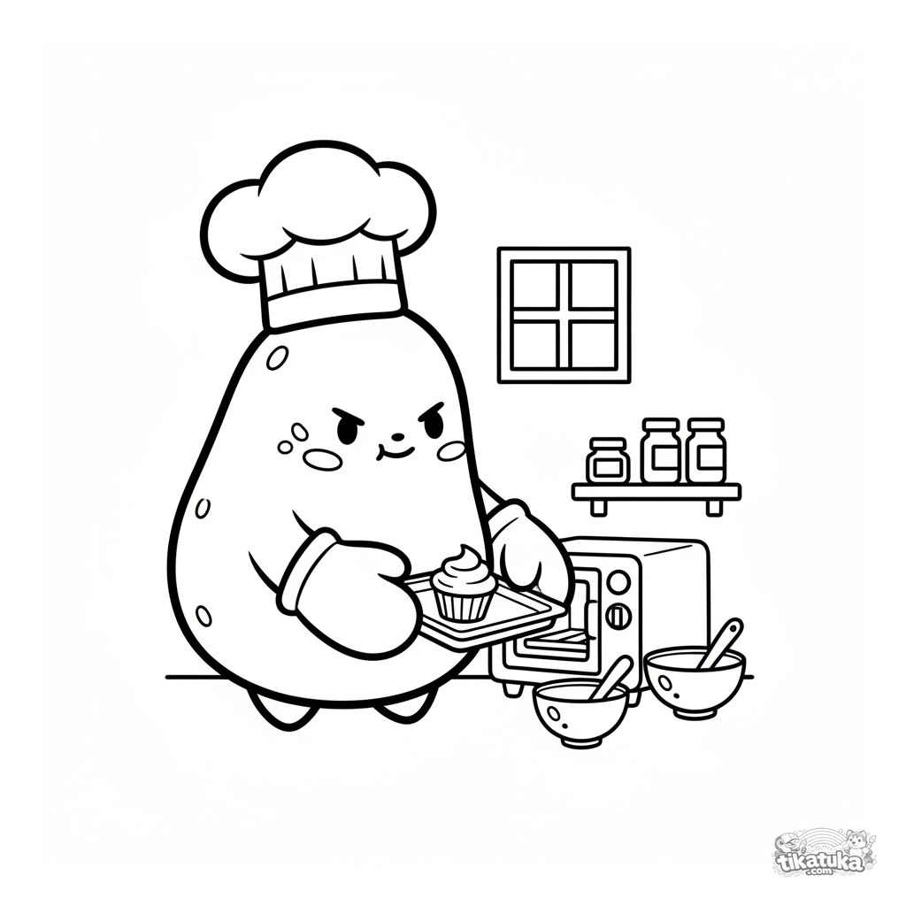 Página para colorear para niños: un monstruo con gorro de chef y manoplas coloca un cupcake en un horno miniatura en una cocina pequeña. Escena divertida.