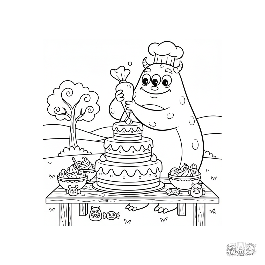 Página para colorear para preadolescentes de 7 a 9 años: un monstruo con gorro de chef decora un pastel grande en una mesa de picnic. Muchos detalles: glaseado, chispas, canasta de dulces.
