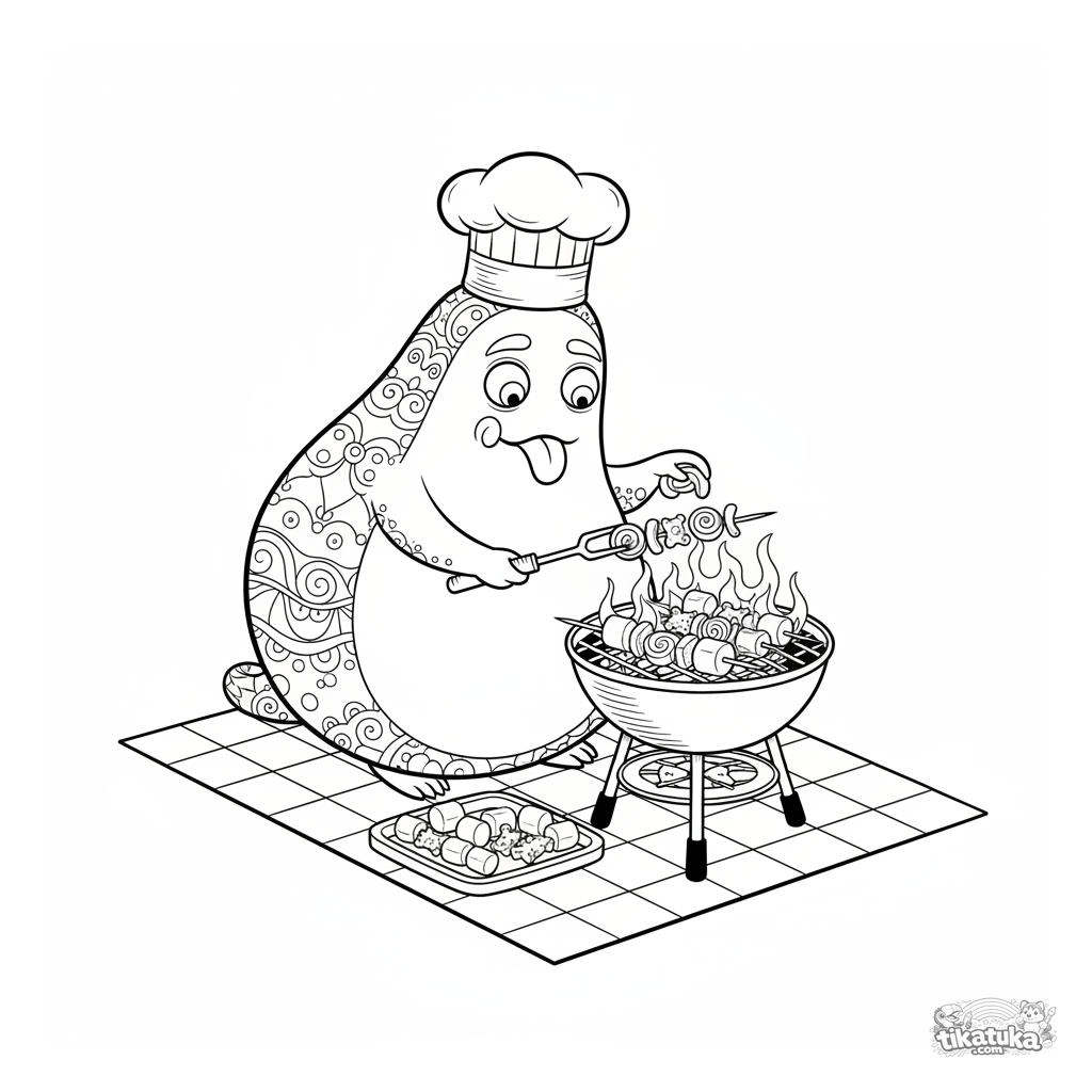 Página para colorear detallada para 10-12 años: un monstruo chef en estilo realista asando brochetas de caramelo en un picnic. Muchos elementos, escena interesante.