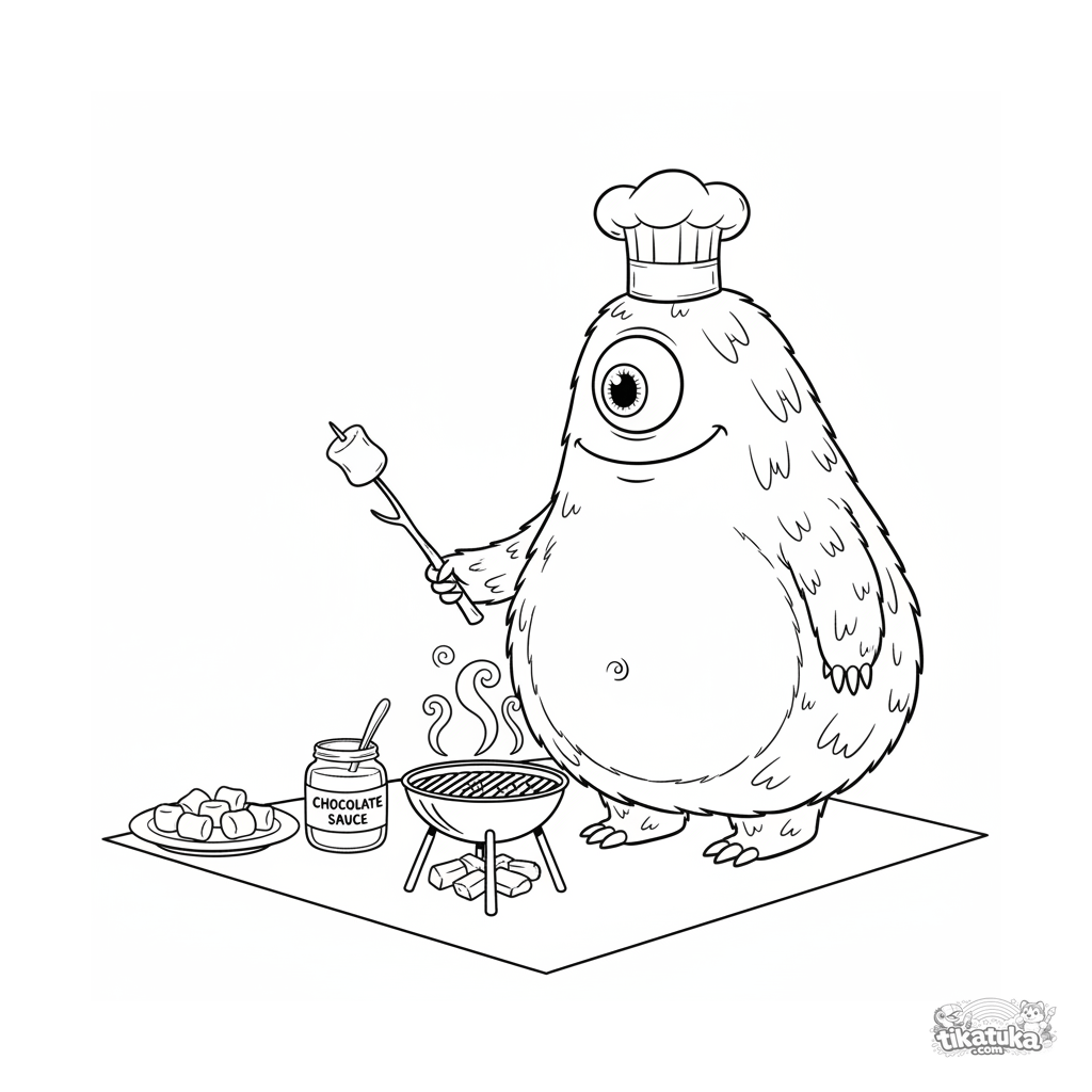 Página para colorear detallada para niños 10-12: un monstruo con gorro de chef asa malvaviscos en un picnic. Contornos intrincados.