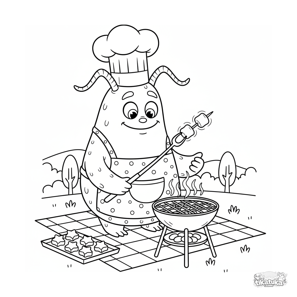 Página para colorear de un monstruo chef asando malvaviscos brillantes en un picnic. Para niños de 4 a 6 años, formas claras y escena divertida.