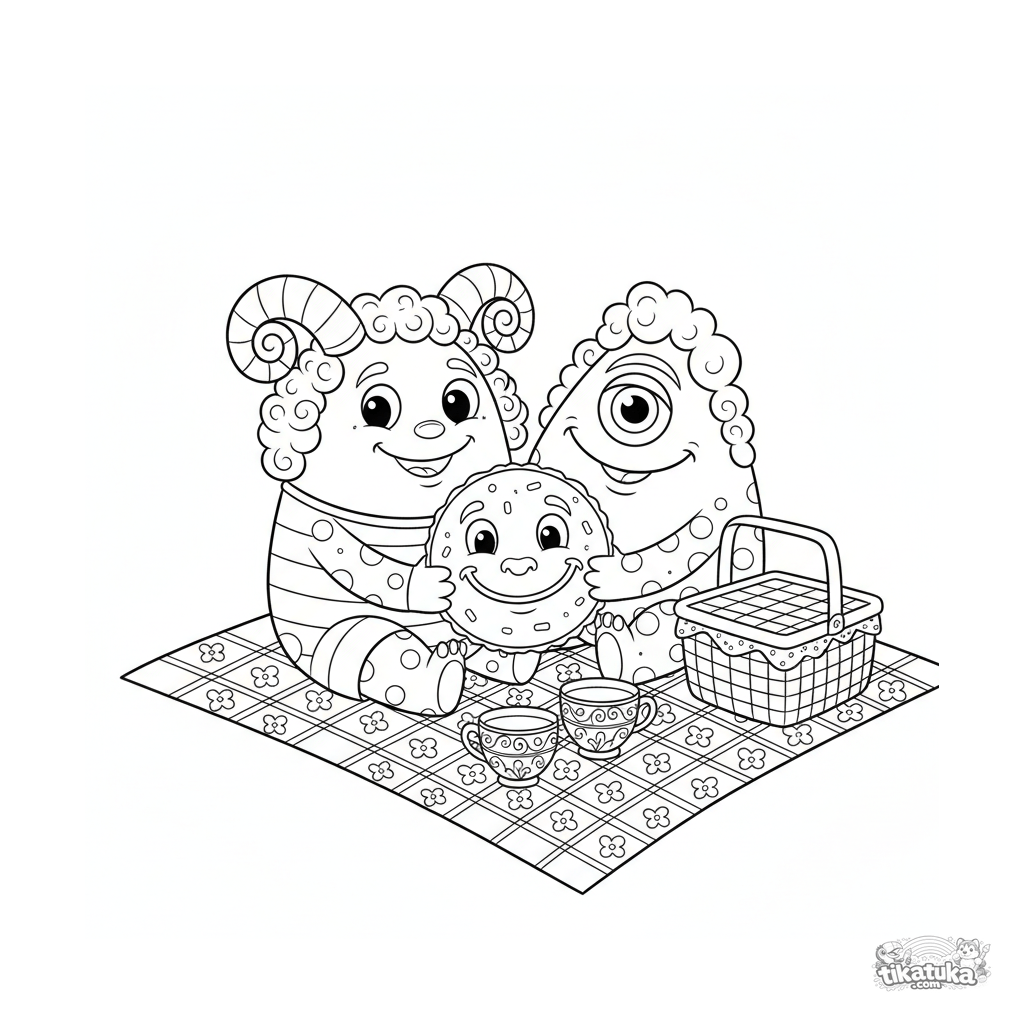 Página para colorear detallada para niños 10-12: dos monstruos amigos compartiendo una galleta gigante en un picnic. Detalles intrincados, tema de amistad.