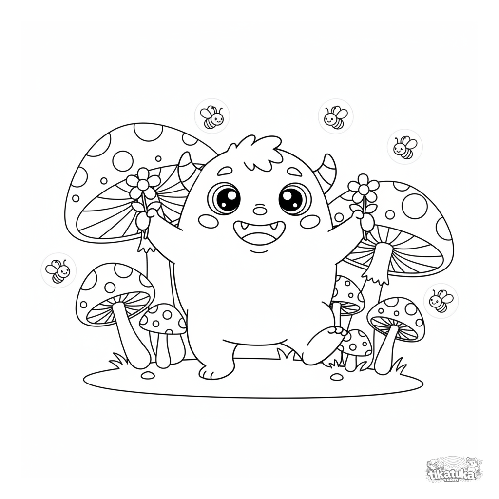 Página para colorear para niños 4-6: un monstruo de peluche con ojos grandes baila feliz en un campo de hongos gigantes. Escena energética y alegre.