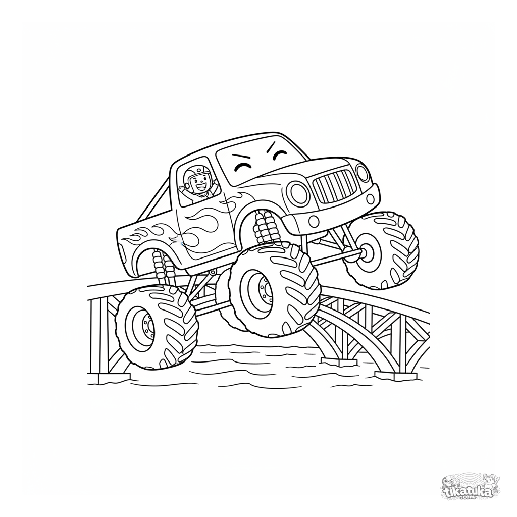 Página para colorear para niños de 4-6 años: un enorme monster truck realizando una acrobacia en un puente sobre un río. Pose dinámica, contornos claros, diseño expresivo estilo 80.