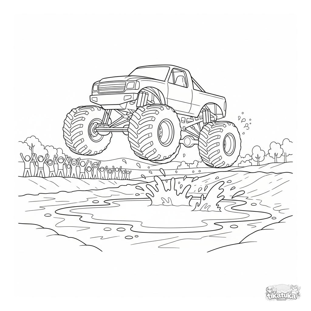 Página para colorear para niños 4-6: un monster truck genial con ruedas enormes realiza un salto sobre un charco de lodo salpicante en una pista de tierra. Escena enérgica y detallada.