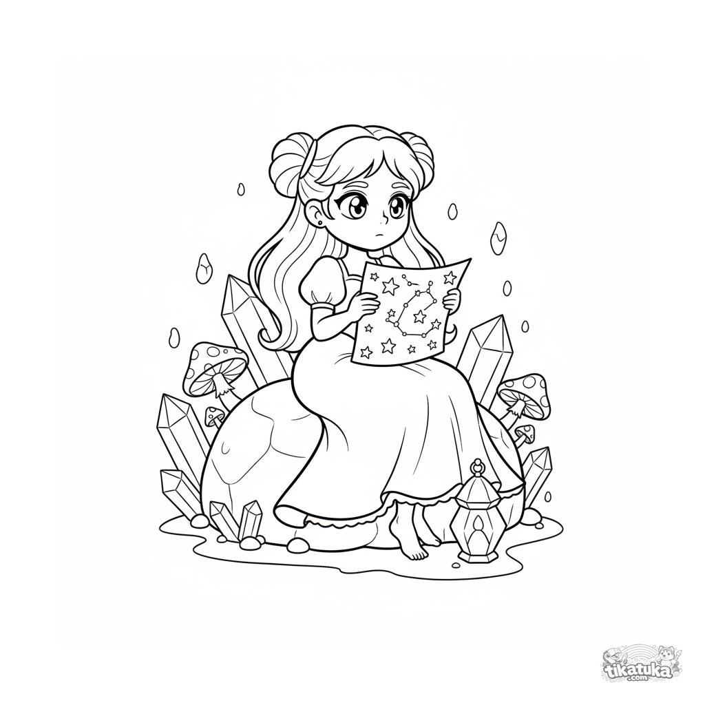 Página para colorear para 4-6 años: una princesa de la luna lee mapas estelares en una cueva de cristal brillante. Cristales bonitos, ojos grandes y expresivos.