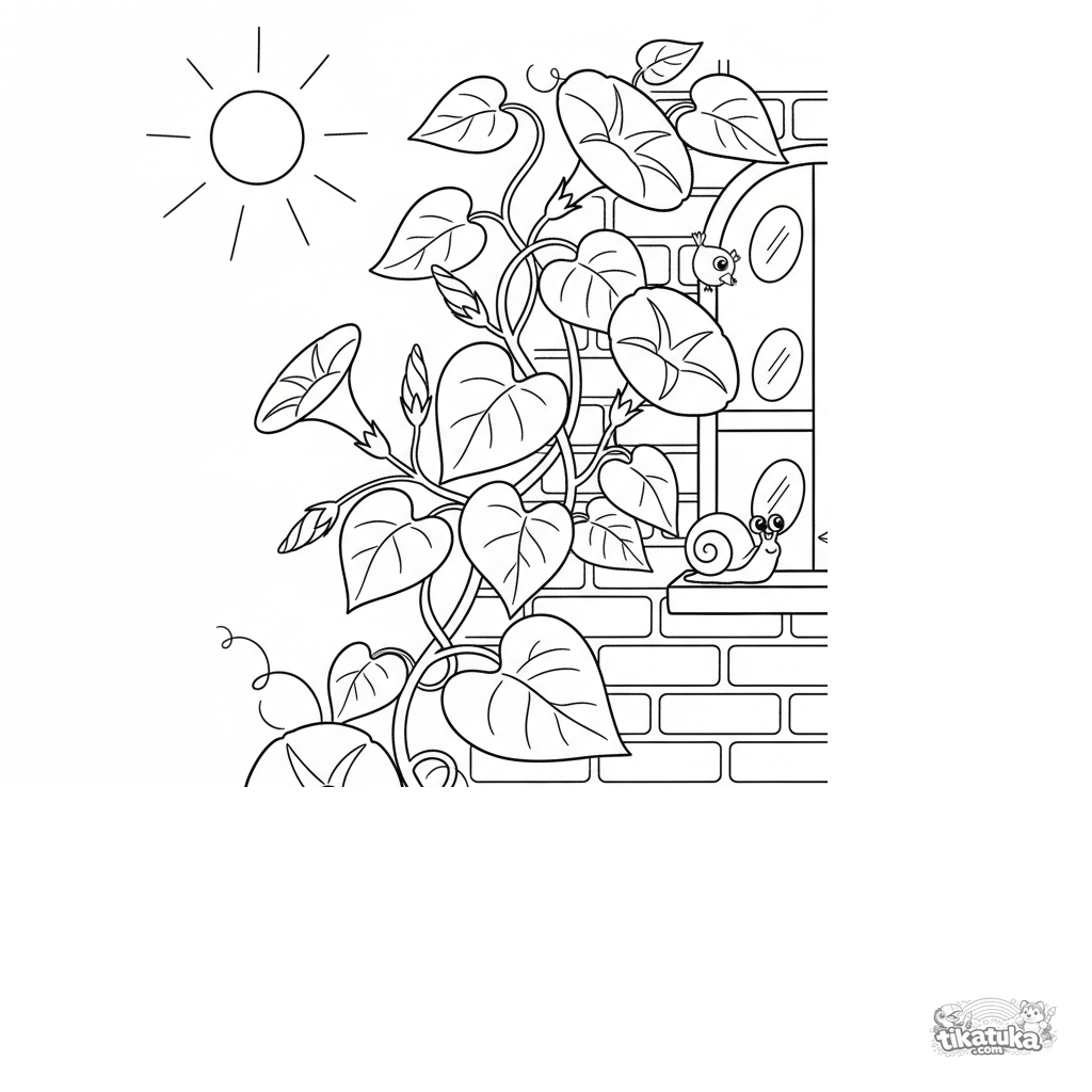 Página para colorear para niños 4-6: una enredadera de campanilla con flores de trompeta crece en un muro de ladrillo junto a una ventana. Caracol en el tallo, mañana de verano.