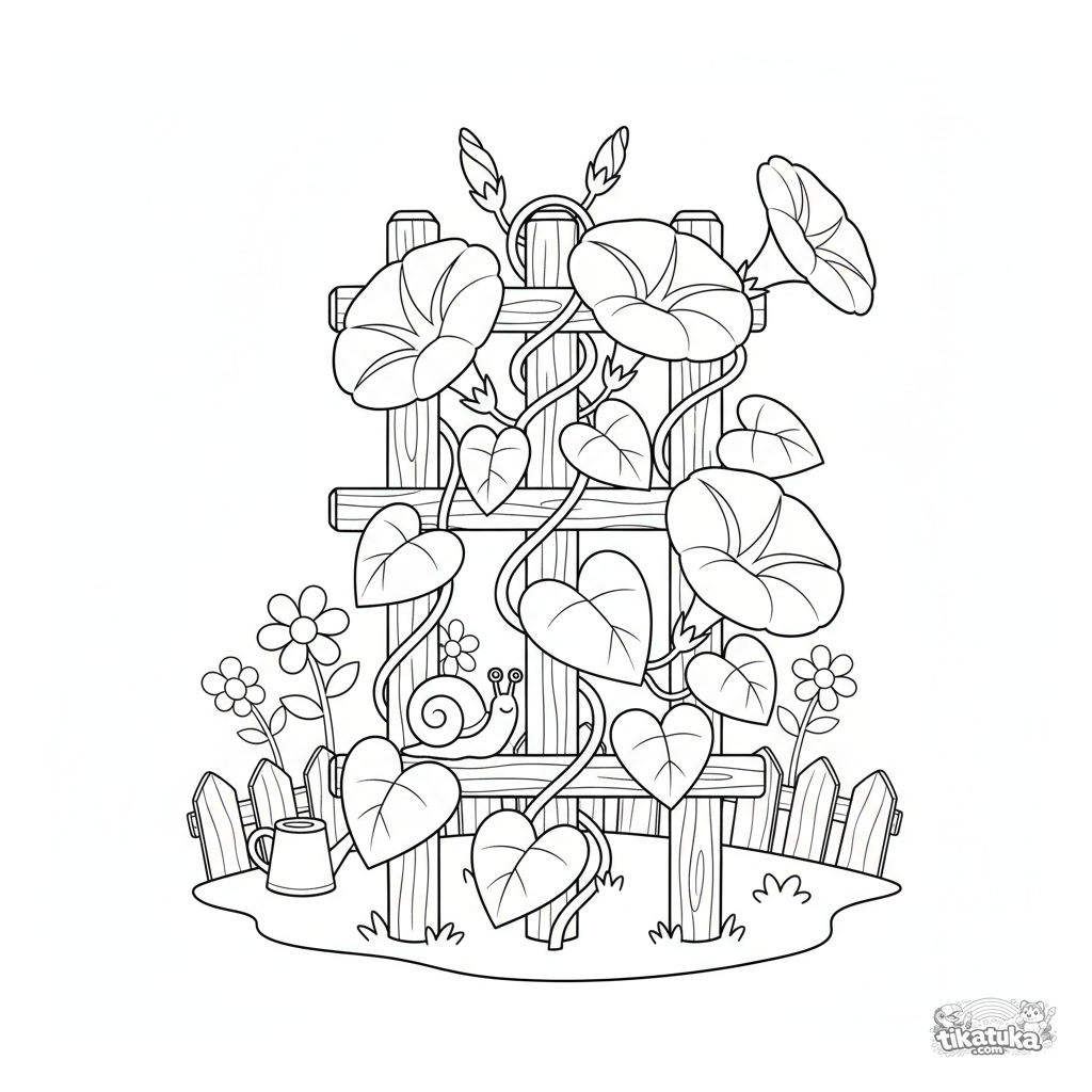 Página para colorear para niños 7-9: una enredadera de campanilla trepando por un enrejado con un caracol. Detalle moderado, escena de jardín.