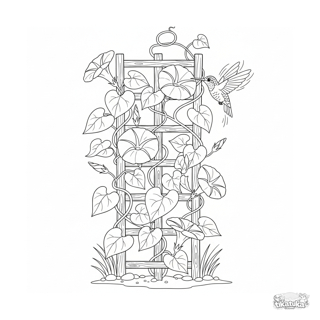 Página para colorear para niños de 4-6 años: una enredadera de dondiego floreciendo trepa por un enrejado de jardín con un colibrí cerca.