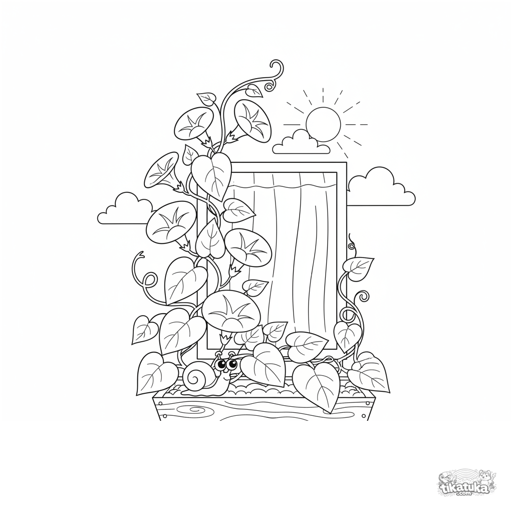 Página para colorear para 7-9 años: una enredadera de dondiego floreciendo en una jardinera de madera, con un caracol. Escena acogedora.