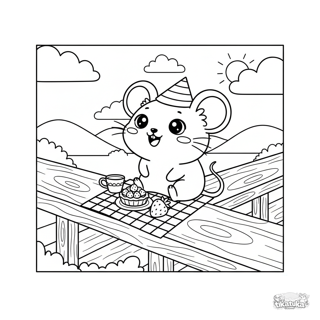 Página para colorear para preadolescentes 7-9: un pequeño ratón con sombrero hace un picnic en la barandilla de un porche con una tarta de bayas.