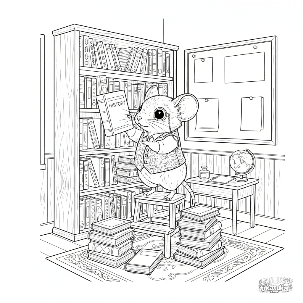Página para colorear detallada para niños 10-12: un ratón bibliotecario organiza libros en una estantería del aula. Estilo naturalista, muchos elementos.
