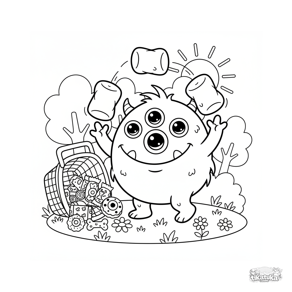 Página para colorear de un monstruo multiojo feliz haciendo malabares con malvaviscos en un picnic. Para niños de 4 a 6 años.