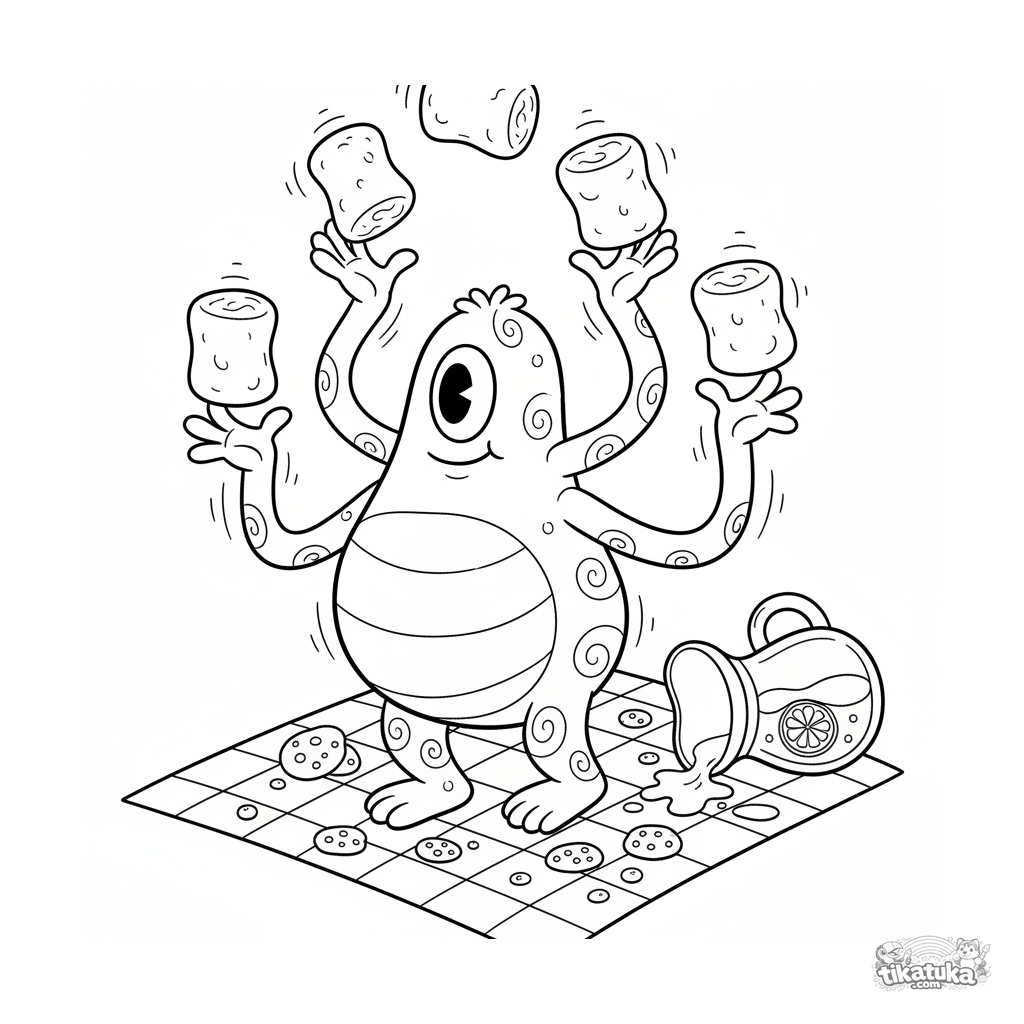 Página detallada para colorear para 10-12 años: un monstruo de cuatro brazos hace malabares con malvaviscos en un picnic. Escena dinámica y divertida.
