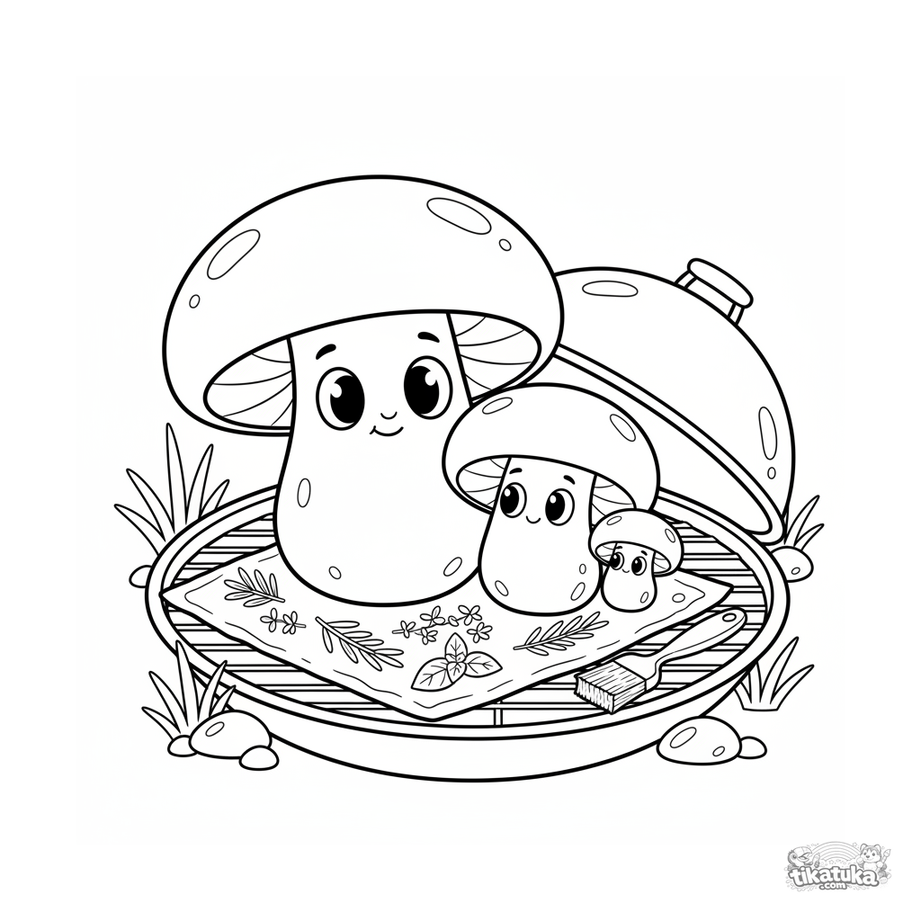 Página para colorear para 7-9 años: una familia de champiñones portobello se relaja en una parrilla de jardín. Estilo cálido de cuento, tema familiar, detalles de aluminio y hierbas.