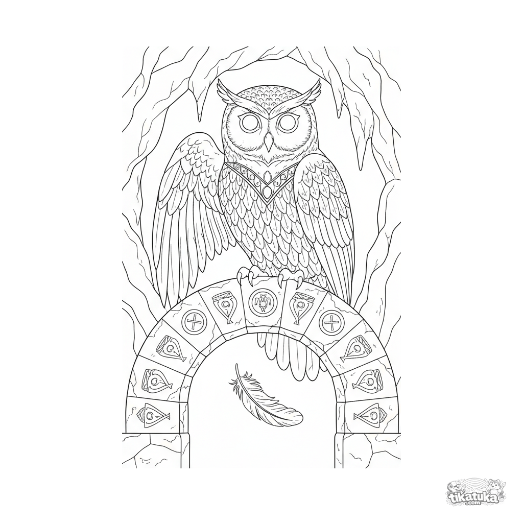 Página para colorear detallada para niños de 10-12 años: un guardián búho-diosa mítico se posa en un arco de piedra en la guarida de la Gorgona. Estilo de guía de campo naturalista, plumaje detallado.