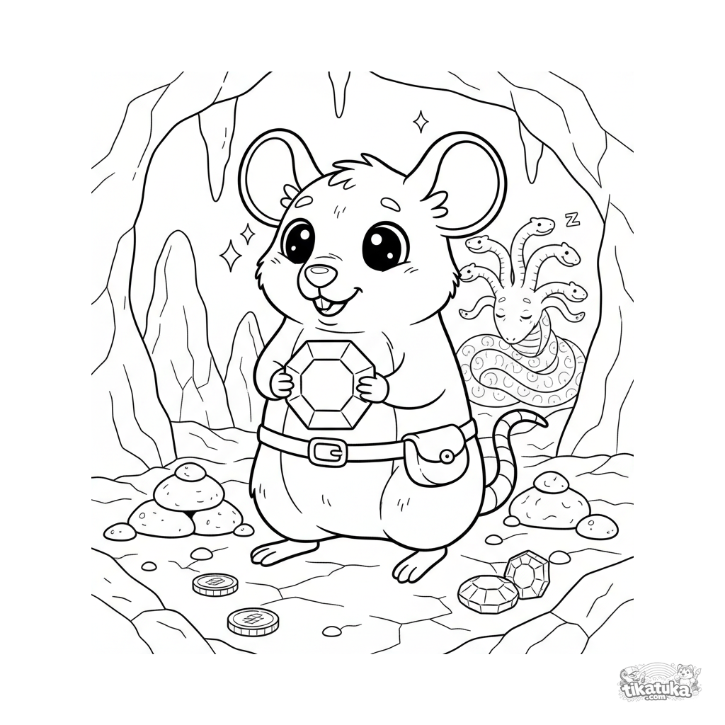 Página para colorear para niños de 4-6 años: una rata mítica linda encuentra una gema en la guarida de la Gorgona.