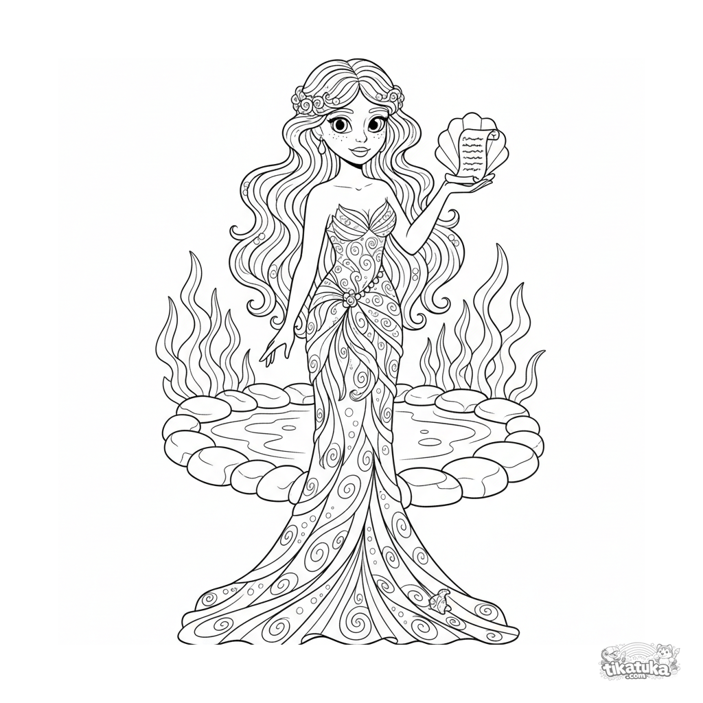 Página para colorear compleja estilo art nouveau: una ninfa marina Nereida entregando un mensaje a la guarida de Medusa.