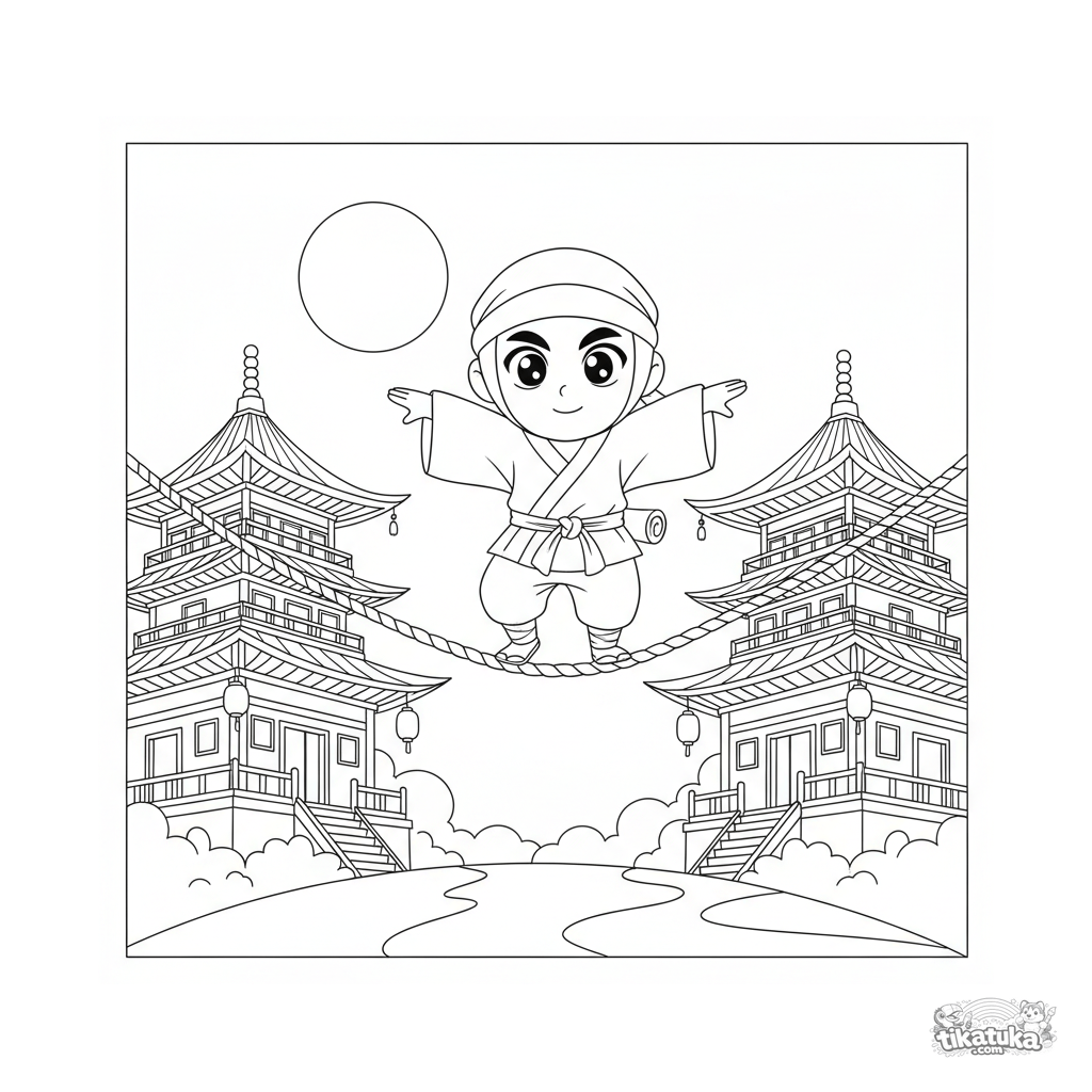 Página para colorear compleja de anime shonen: un estudiante ninja se equilibra en una cuerda entre tejados de pagoda bajo la luna, con un pergamino en el cinturón.