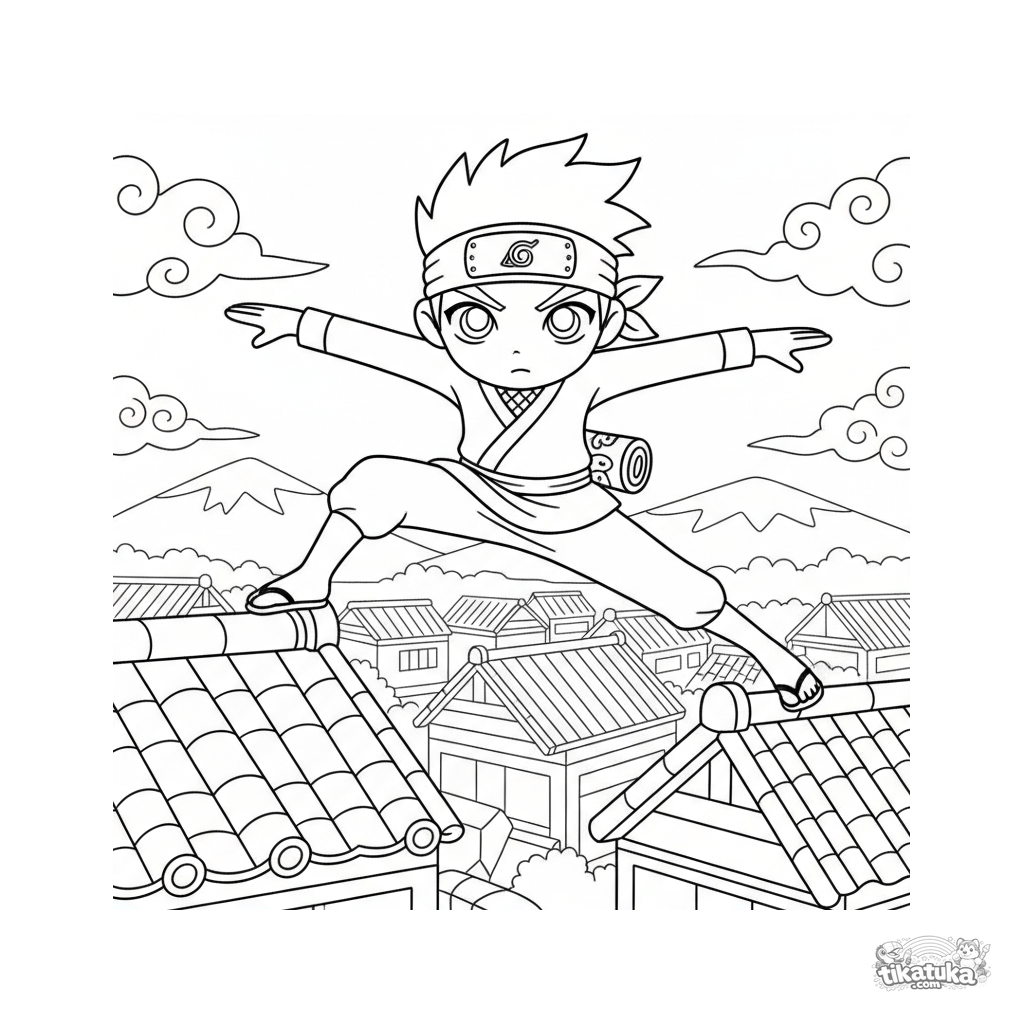 Página para colorear estilo anime dinámica para 10-12 años: un aprendiz ninja salta entre tejados durante una sesión de entrenamiento de parkour en un pueblo tradicional al atardecer.