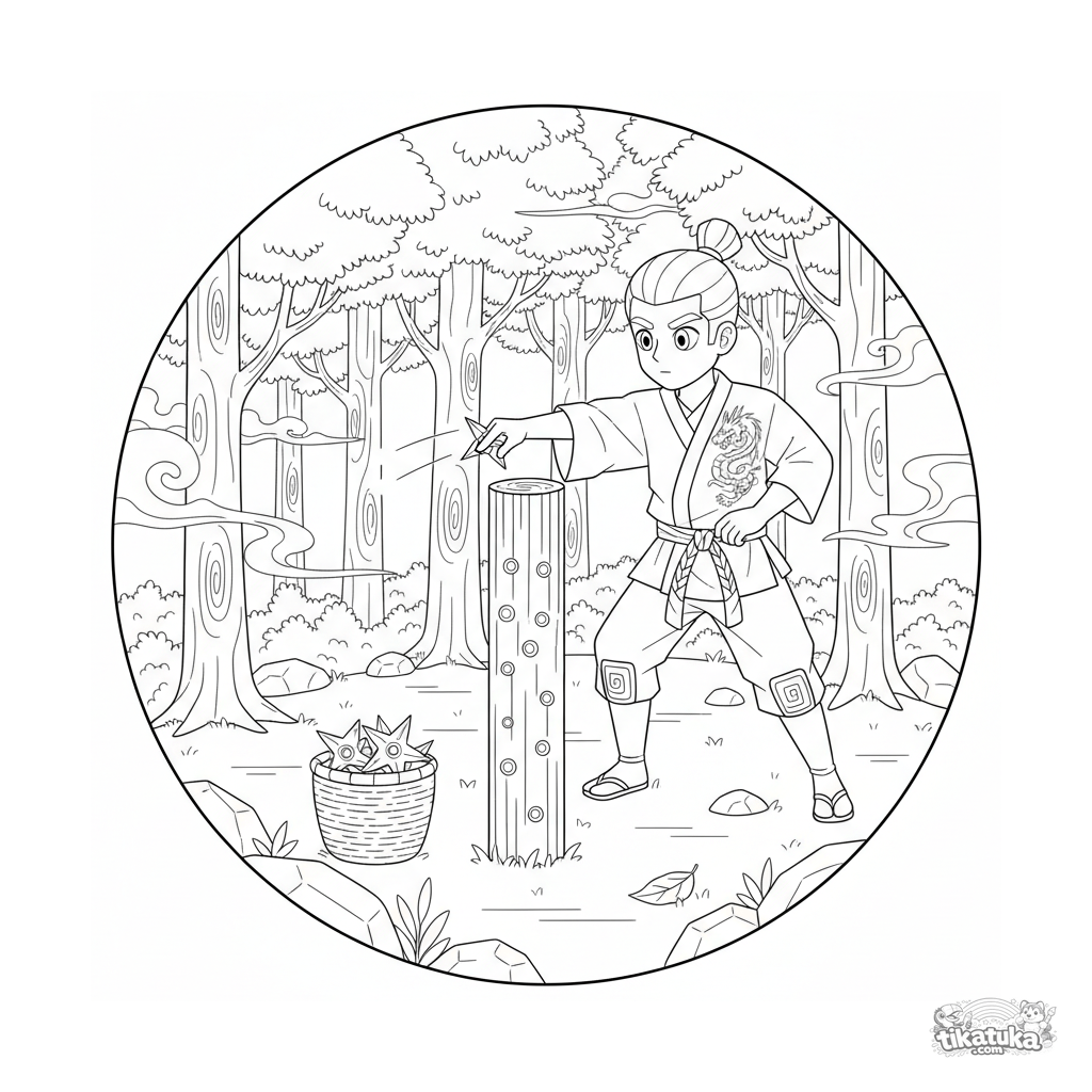 Página para colorear detallada estilo manga: un estudiante ninja practica lanzamiento de shuriken en la niebla matutina de un terreno de entrenamiento forestal secreto.