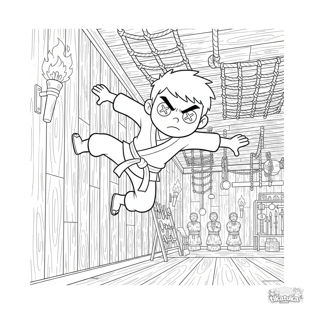 Página enérgica para colorear shonen-anime: un estudiante ninja realiza una carrera en la pared en un vasto salón de entrenamiento. Escena dinámica compleja con detalles interiores para 10-12 años.