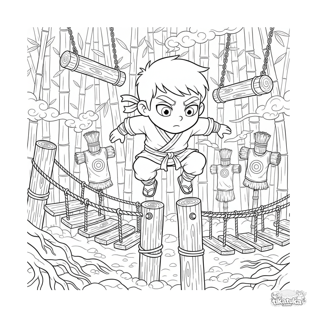 Página para colorear manga-acción dinámica: un estudiante ninja entrena en una pista de obstáculos en el bosque. Composición compleja con bambú para 10-12 años.