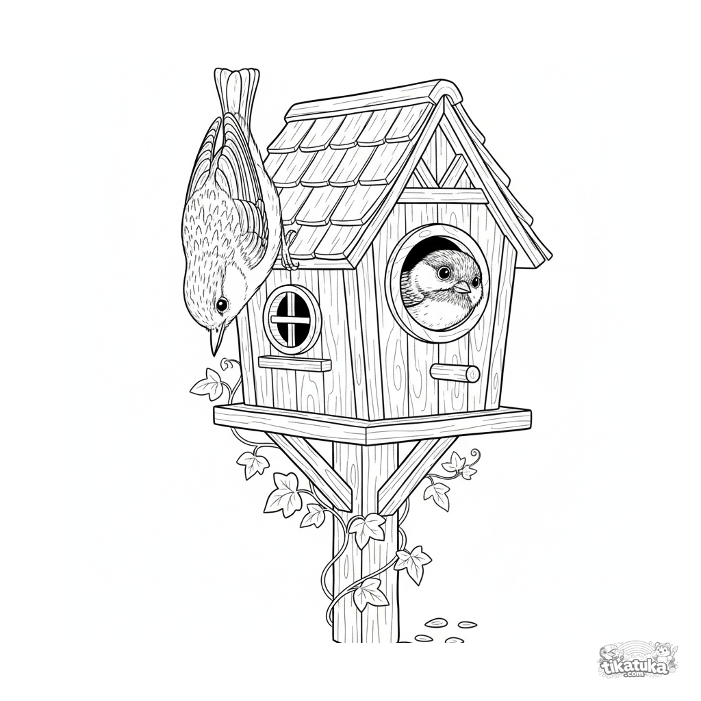 Página para colorear intrincada para 10-12 años: un trepador azul y un carbonero en la ventana de una casa de pájaros detallada. Escena con texturas, plantas e interacción de aves.