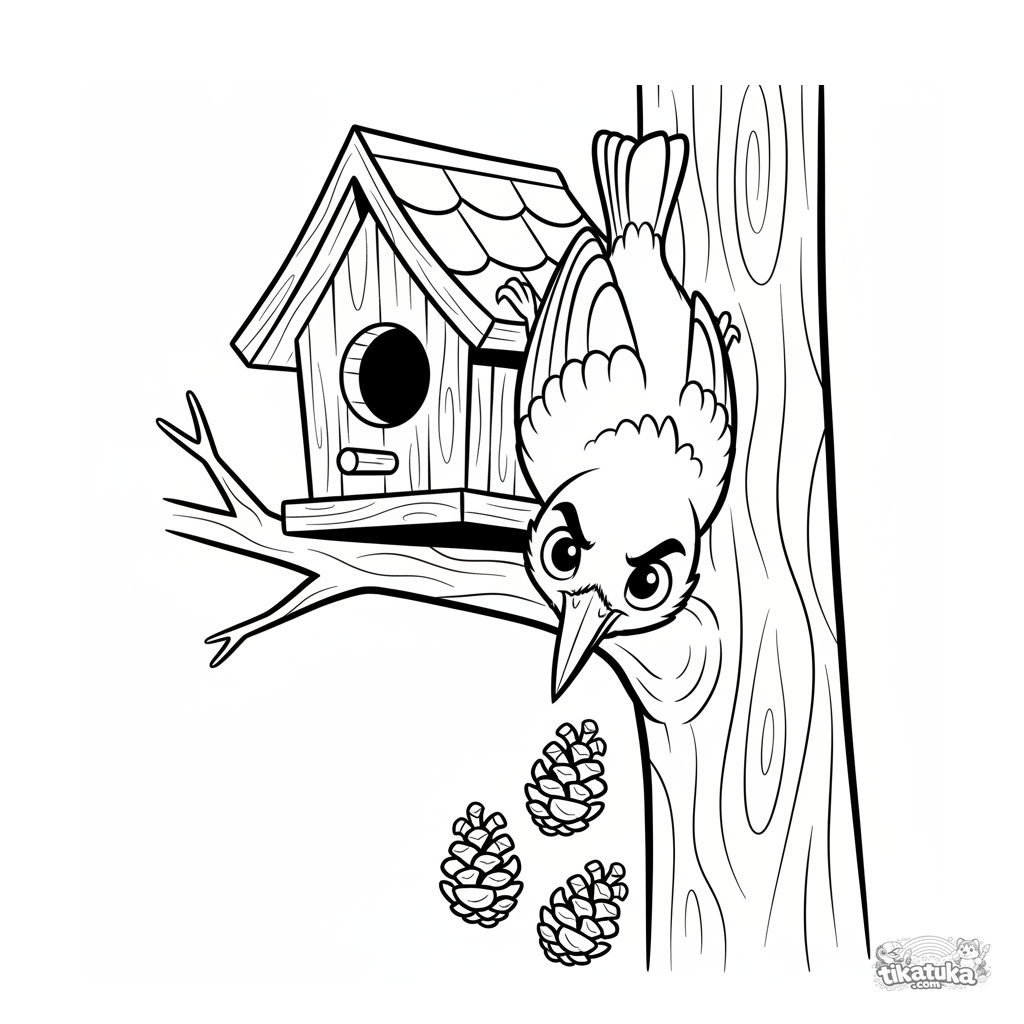 Página para colorear para 7-9 años: un ágil trepador azul cuelga boca abajo del techo de una casa de pájaros de madera. Pose dinámica, rasgos expresivos en estilo cómic.