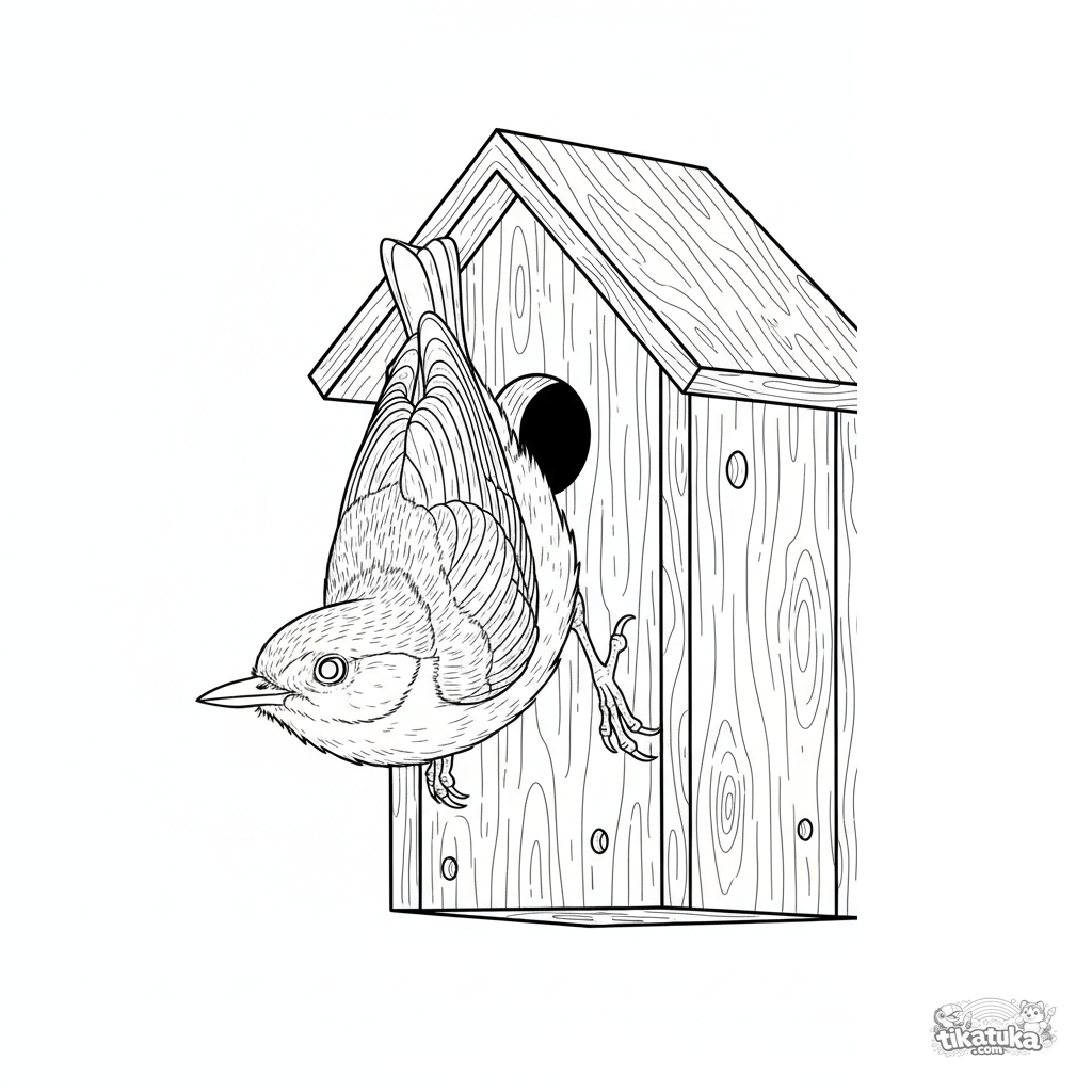 Página para colorear compleja para niños 10-12: un trepador realiza una hazaña acrobática, aferrándose boca abajo al costado de una casa de pájaros de madera mientras busca insectos.