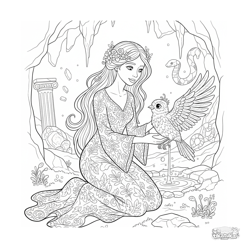 Página compleja estilo art nouveau para niños 10-12: una ninfa en un manantial en la guarida de la Gorgona cura un pájaro petrificado. Líneas fluidas elegantes, renderizado detallado.