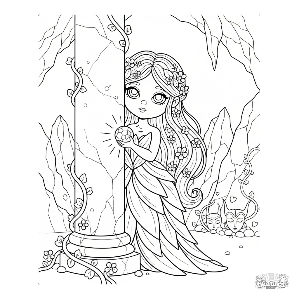 Página para colorear estilo arte nouveau para niños 4-6: una tímida ninfa con pelo de hojas se asoma detrás de una columna en la guarida de la Gorgona. Líneas fluidas.