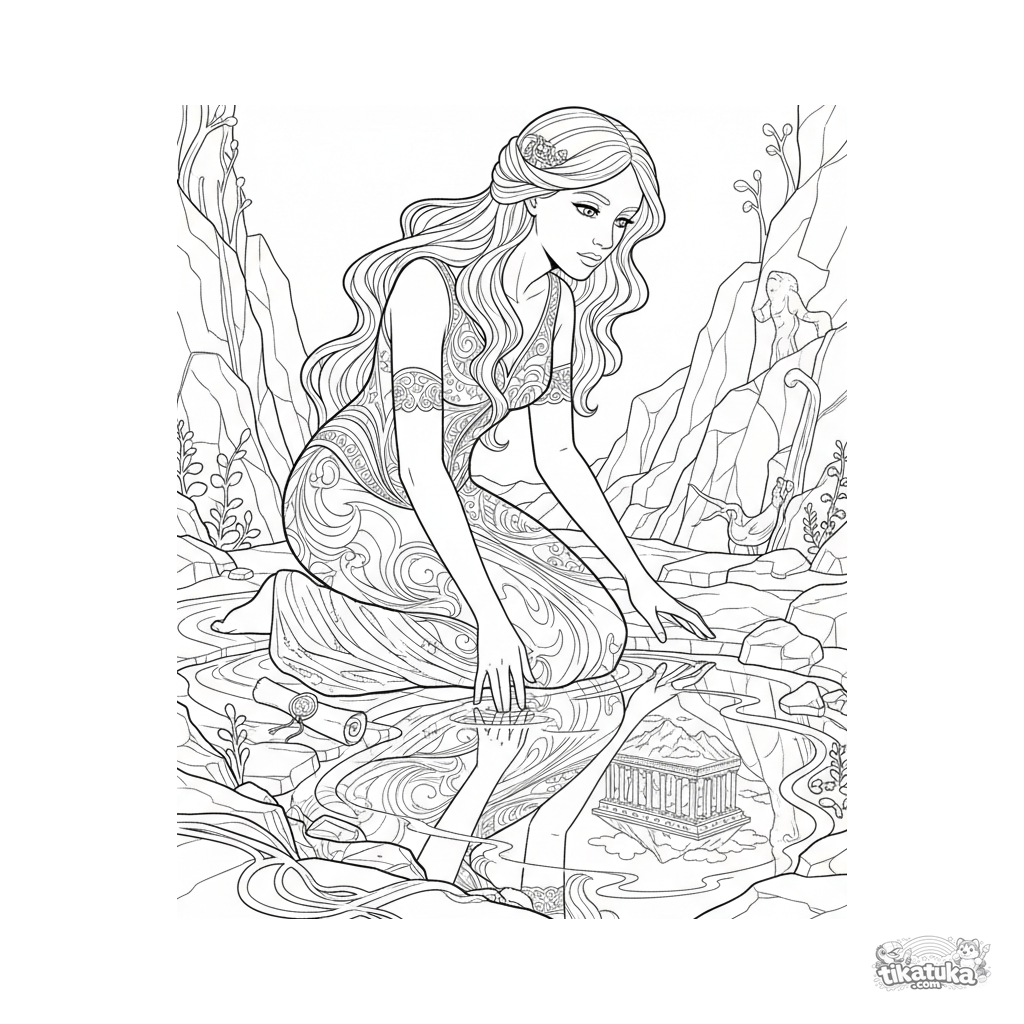 Página para colorear detallada para niños 10-12: una ninfa mensajera se arrodilla junto a un estanque oscuro en la guarida de la Gorgona.