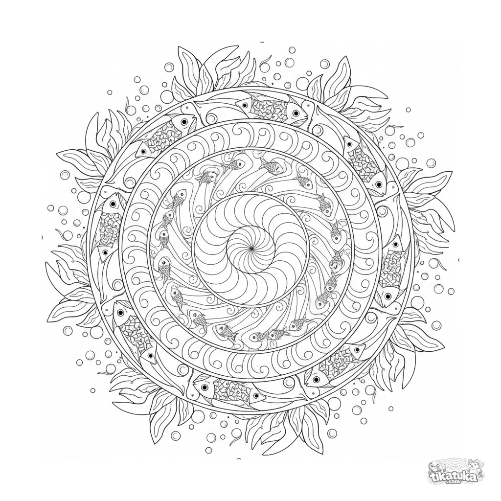 Página para colorear de mandala oceánica detallada con concha, olas y peces para niños de 10 a 12 años. Un mundo submarino simétrico con muchos elementos para colorear creativamente.