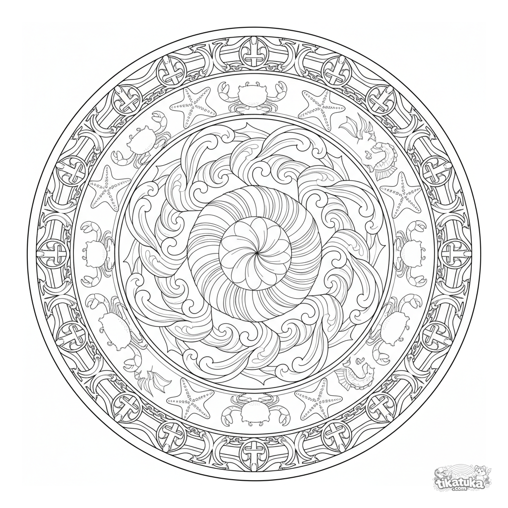 Detallado mandala oceánico para colorear con caracola, olas y criaturas marinas. Patrón simétrico intrincado para niños de 10 a 12 años.