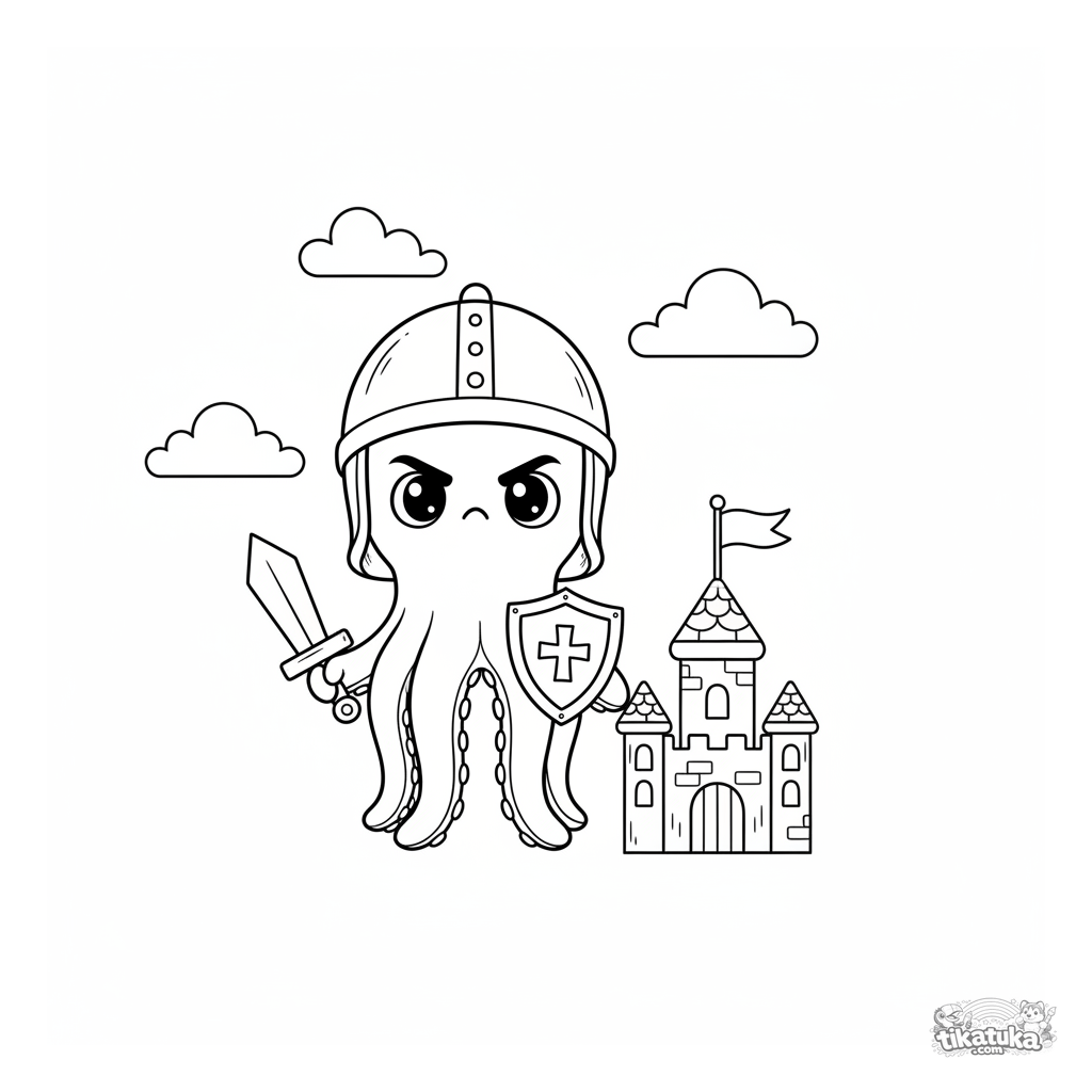 Página para colorear para niños 4-6: Pulpo Bublik como valiente caballero guarda un castillo de juguete. Formas geométricas, estilo juguete de madera.