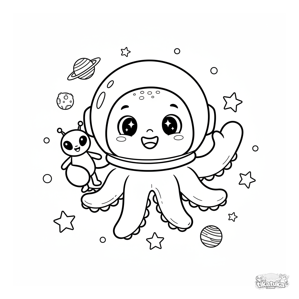 Página para colorear para niños: un pulpo en traje espacial flota feliz entre planetas y estrellas, conociendo a un amigo alienígena. Estilo mascota de peluche.