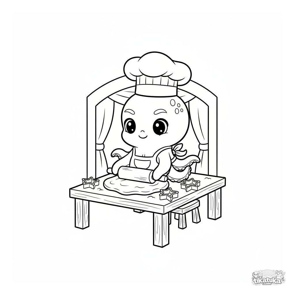 Página para colorear para niños 4-6: Pulpo Bublik con gorro de chef hornea galletas. Profesión linda, formas simples de masa y rodillo.