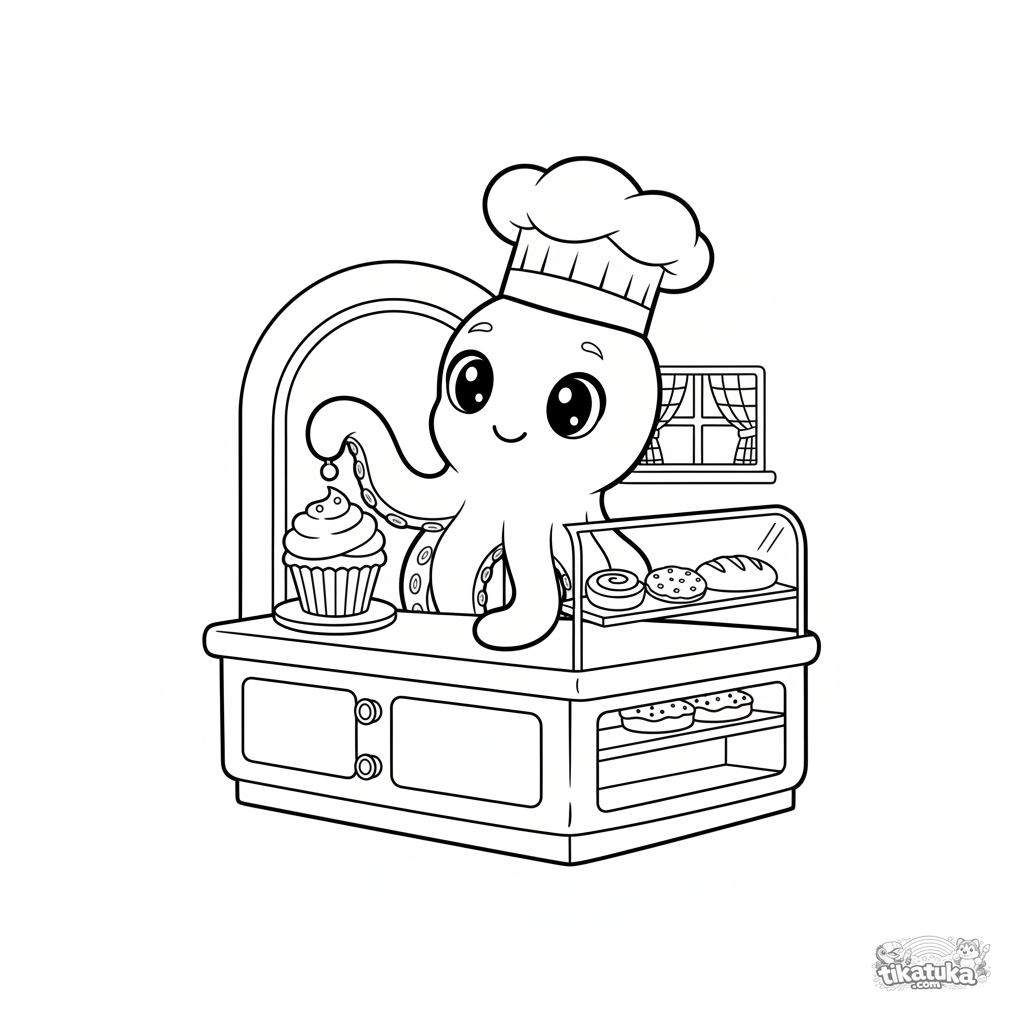 Página para colorear comida: Pulpo Bublik trabaja como pastelero decorando una magdalena. Escena tierna de pastelería, formas simples, para 4-6 años.