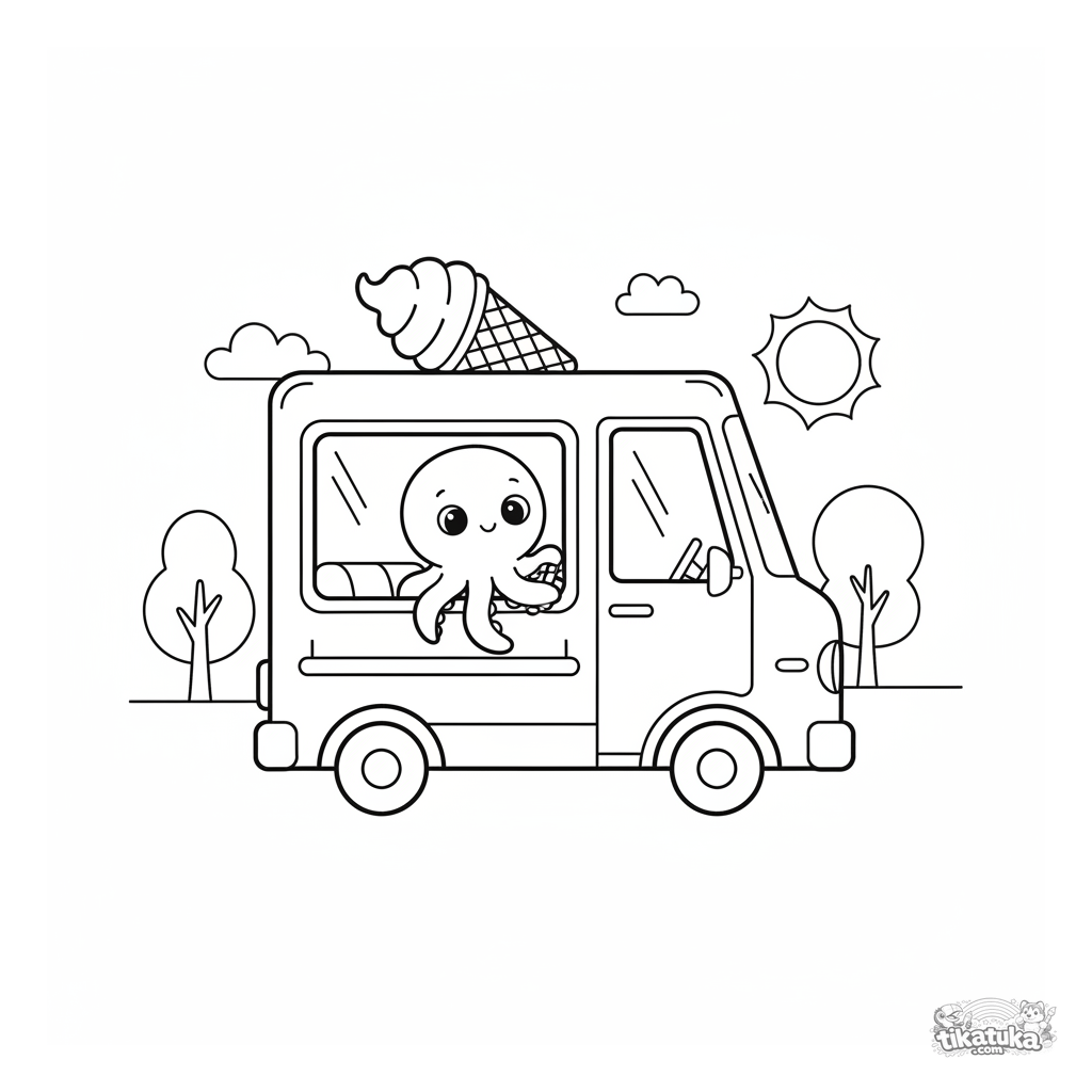 Página para colorear para niños 4-6: Pulpo Bublik conduce una alegre camioneta de helados. Formas geométricas simples, estilo juguete de madera.
