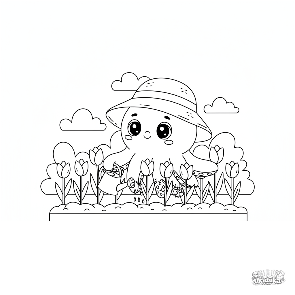 Página para colorear para niños: Pulpo Bublik con sombrero de jardinero riega tulipanes con una regadera. Escena linda, formas simples, márgenes amplios.