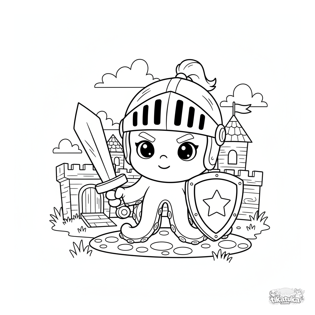 Página para colorear para niños: Pulpo Bublik con armadura de caballero guarda un castillo de juguete. Estilo de juguete de madera, formas simples.
