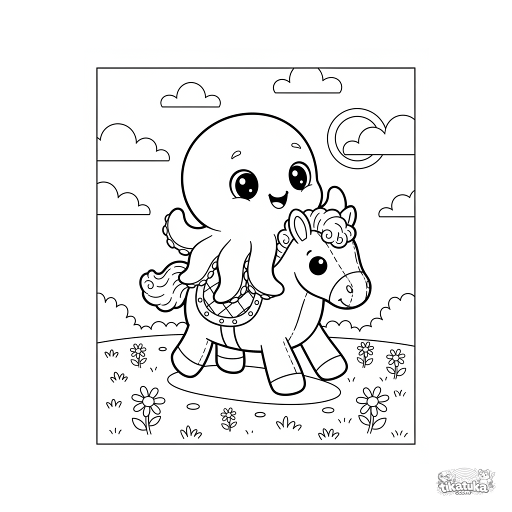 Página para colorear para niños: el lindo Pulpo Bublik montando un pony de juguete en un prado. Líneas simples, márgenes amplios, para 4-6 años.